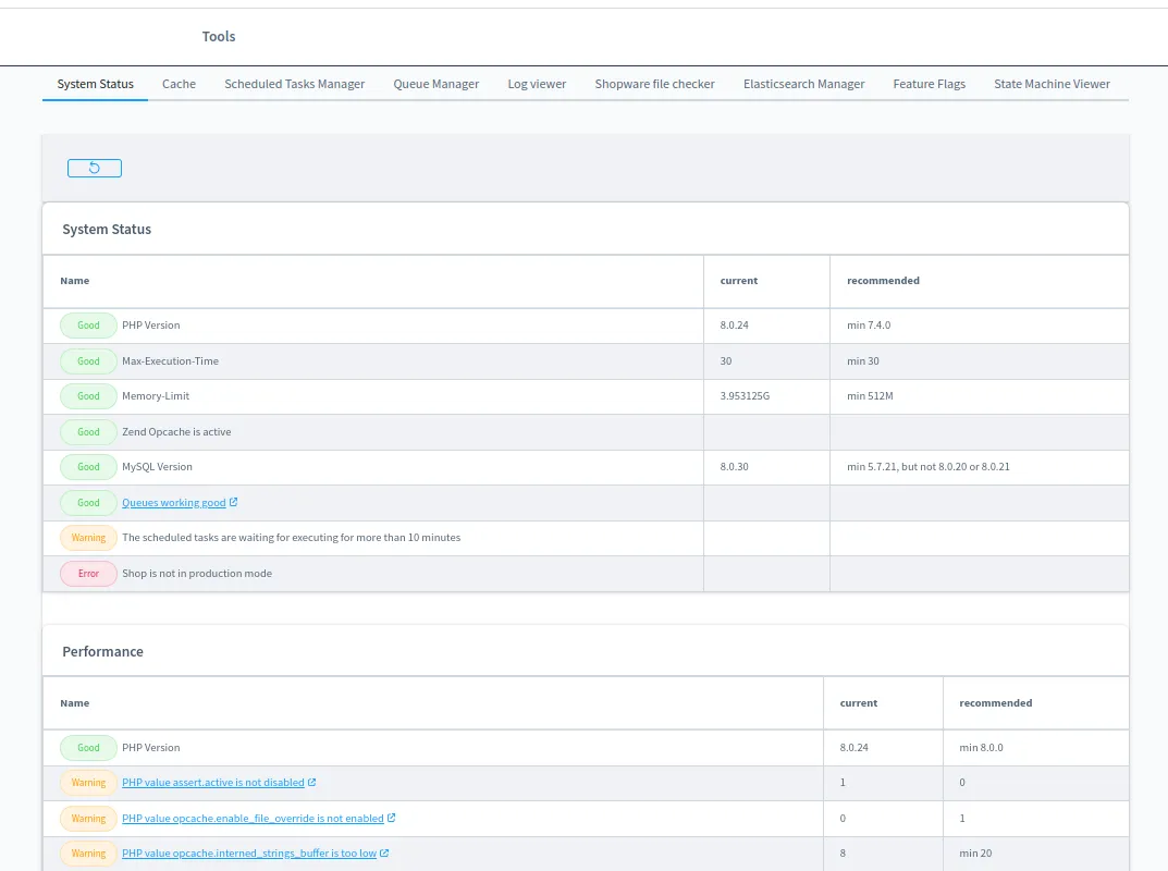 - System Status: Gain a quick overview of your Shopware 6 environment. Frosh Tools checks your PHP version, MySQL health, and even the queue system’s functionality. It also identifies potential performance optimizations and provides helpful documentation links to address them.