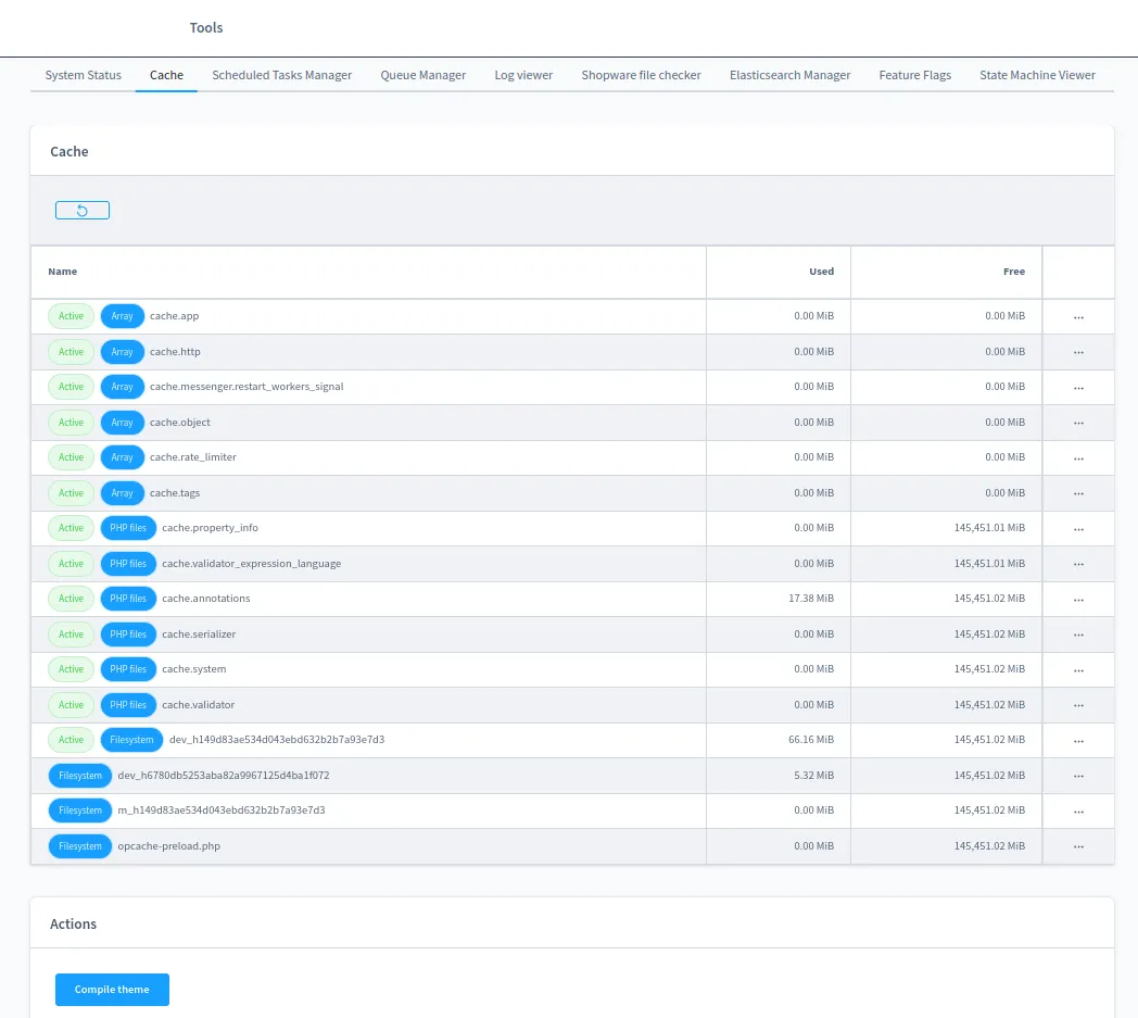 - Cache Management: Frosh Tools takes the reins on your Shopware 6 cache. View details of the App and Http caches, along with all folders within the var/cache directory. Need to clear specific caches? Frosh Tools lets you do that with a click. Additionally, compiling your theme is a breeze with this plugin.