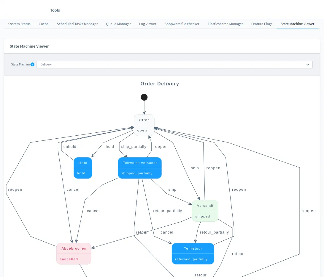 - State Machine Visualization: Understanding the order processing workflow, transactions, and deliveries can be complex. Frosh Tools offers a basic visualization of these state machines, providing a clearer picture of these crucial processes.